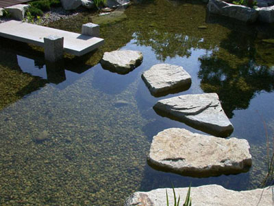 Von der Terrasse aus gelangt man über einen Granitsteg und einige Trittsteine ans andere Ufer.