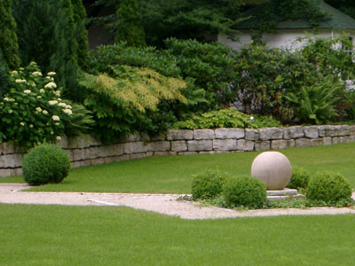 In diesem Garten wurde ein streng symmetrisches zentrales Element angelegt: Eine Sandsteinkugel auf einem kleinen Podest wird von einem rautenförmigen Schotterweg umspielt. Die vier Buchsbaumkugeln bilden einen Rahmen um die Steinkugel. Am hinteren Ende der Achse wird das Kugelelement noch einmal aufgegriffen durch die zwei Buchs rechts und links der Mauernische.