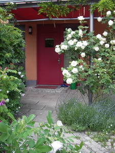 Derselbe Eingang drei Jahre später: Am Hauseingang begrüßen Sie üppige Kletterrosen, der Blauregen erobert das Vordach, duftender Lavendel hebt die Grenzen zwischen dem Eingangsweg und der Pflanzfläche auf.
