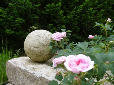 Märchenhaftes Ambiente: Die Rose „Königin von Dänemark“ ziert mit ihren silbrig-rosa Blüten die von uns errichtete Mauer aus fränkischem Jurakalk.