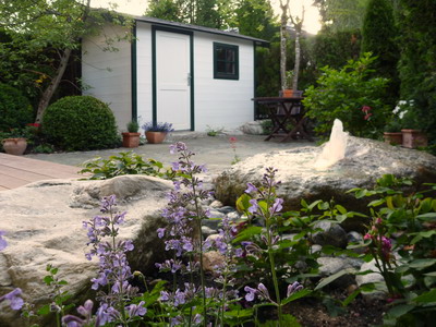 Flair und Gemütlichkeit sind keine Frage des Platzes: Mit einer geschickten Planung bringen wir Ruhe in den Garten und schaffen genügend Abwechslung, damit es immer etwas Neues zu Entdecken gibt. Den flachen Granitfindling rechts haben wir zum Sprudeln erweckt. Eine in den Stein eingearbeitete Quellmulde wird von vielen Vögeln ausgiebig zum Baden und Trinken genutzt.