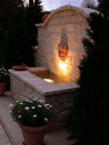 Soeben fertiggestellt: Sicherlich fehlt diesem mediterranen Wandbrunnen noch etwas Patina, doch wenn die Baccus-Fratze erst einmal von wildem Wein und Efeu umrankt ist bietet nicht nur das muntere Plätschern des Wassers einen stimmungsvollen Hintergrund für die schönsten Stunden auf Ihrer Terrasse. Die Sonne verschwindet bereits hinter dem Horizont, während der Wasserspeier durch geheimnisvolle Lichtreflexionen an der Wasseroberfläche zu neuem Leben erwacht.