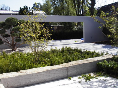 Ein nach unseren Entwürfen gefertigter Reliefstein aus Muschelkalk lädt zum Sitzen an der Terrasse ein und stellt optisch eine gelungene Verbindung zum Torbogen im Hintergrund dar.