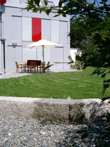 Um nicht von der modernen Architektur der Fassade abzulenken wurde auch hier das Gartenkonzept nach minimalistischen Grundsätzen auf das Wesentliche reduziert. Im Garten zieht alle Aufmerksamkeit die 5 Meter lange, gebrochene Granitstele auf sich. Aus der Bruchstelle sprudelt Wasser und bringt so Leben in die Statik der formalen Skulptur.