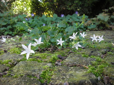 Sterntaler: Diese Glockenblumen haben in den Fugen des Pflasterbelages eine neue Heimat gefunden. Wie wunderbar entwickelt sich ein Garten, wenn er fantasievoll angelegt ist und der Natur Zeit lässt.