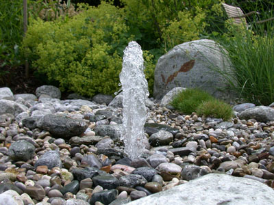 Ein kleiner Geysir zwischen Eiszeitfindlingen und Geröll lockt den Betrachter in den Garten. Das bewegte Wasser fesselt den Blick und lädt zum Verweilen ein. Solche einfachen Wassersprudel sind leicht zu realisieren, sie überzeugen durch geringen Pflegeaufwand und niedrige Unterhaltskosten. Selbstverständlich lassen sich auch mehrere Sprudel in einer Geröllfläche kombinieren.