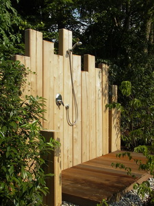 Wellness: Wasser im Garten hat bei uns viele Gesichter, hier haben wir eine einzigartige Erfrischungsmöglichkeit geschaffen. Die Gartendusche ist mit Robinienholz-Schwellen gebaut und liebevoll umgrünt.