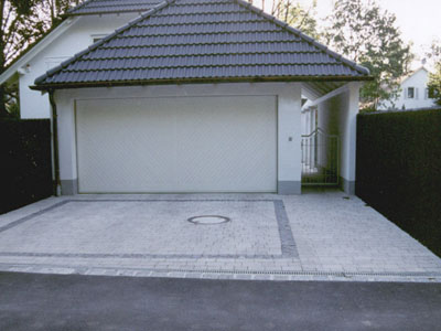 Eine funktionale Garageneinfahrt: das Betonpflaster wurde mit einem Rahmen aus Granit-Kleinsteinpflaster aufgelockert.