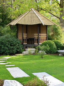 Individuell gestaltete Gartenlauben, Pavillons und Pergolen runden unser umfangreiches Holz-Sortiment ab. Für diesen asiatischen Garten haben wir einen exotischen Pavillon entworfen. Die Kombination aus hellem Bergbambus und dunklem Kiefernholz unterstreicht den fernöstlichen Charakter. Bei der Planung haben wir uns an den Bedürfnissen der traditionellen japanischen Teezeremonie orientiert. Dies betrifft insbesondere die aufgeständerte Bauart und die Trittstufen, die gezielt darauf ausgelegt sind, die Geschwindigkeit der Gäste beim Eintreten zu bemessen. So bleiben Außenwelt und Alltag zurück, wenn man die letzten Felsstufen vor dem Teehäuschen hinter sich lässt.