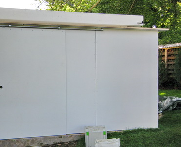 Zu einem modernen Haus mit schlichten, klaren Formen passt einfach kein Gartenhaus in Nut-und-Feder-Optik, selbst wenn es weiß gestrichen ist. Dieser etwa 2x3 m große Garten-Abstellraum ist mit einer breiten Schiebetüre ausgestattet und führt die schnörkellose Optik des Hauses fort.