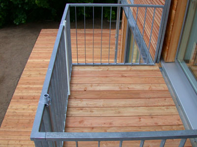 Gelungenes Design: Unsere Holzbeläge auf dem Balkon und der Terrasse passen perfekt zu der schlichten Fassade aus Lärchenholz.