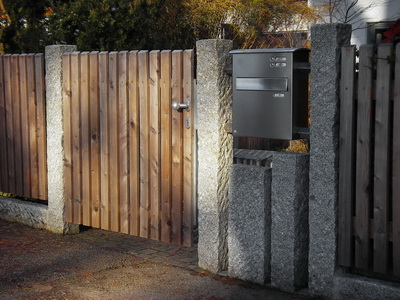 Eine zeitlos schöne Verbindung aus Holz und Stein: Zaunfelder aus Lärchenholzlatten fügen sich mit ihrer glatten Oberfläche elegant zwischen die rauhen Granit-Säulen ein. Noch ist die hölzerne Farbe der Latten zu erkennen, in ein paar Jahren sind es durch die Verwitterung nur noch Nuancen von Grau. Dann kommen die unterschiedlichen Strukturen noch viel deutlicher zum Tragen.