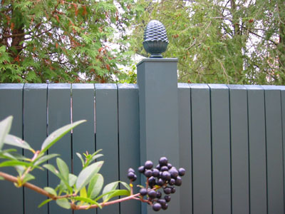 Als geschmackvoller Sichtschutz präsentiert sich dieser Holzzaun in klassischem dunkelgrün. Ein liebevolles Detail sind die Pinienzapfen, die als Abschluss auf den Zaunpfosten das Holz schützen und dem Werk eine individuelle verspielte Note geben.