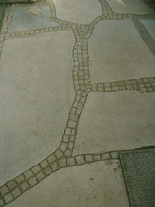 Liebevoll verlegte Polygonalplatten aus Mettener Granit, die Fugen werden durch Mosaikpflaster betont.