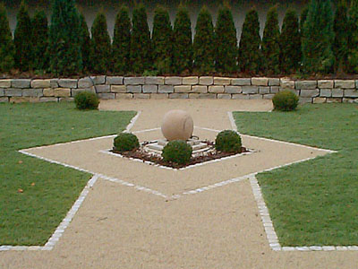 In dieser formalen Gartenanlage haben wir die Wege mit einem Belag aus hellem Kalksteinsplitt angelegt. Als Einfassung dienen getrommelte Pflasterplatten, die auch als Sockel für die Sandsteinkugel verwendet wurden. In der Trockenmauer im Hintergrund ist eine Nische für eine Gartenbank vorgesehen.