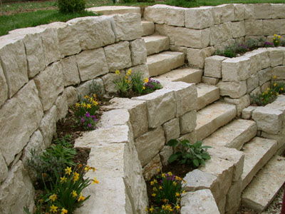 Diese große Kellerböschung wurde der Form des Hauses nachempfunden. Durch die zurückhaltende Bepflanzung und den hellen Stein gelangt viel Licht in das Souterrain. Die Treppe erleichtert die Pflege der Anlage.