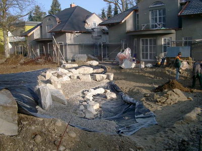 So, jetzt kanns losgehen: Der Teich wurde ausgehoben, die Grube mit Sand modelliert und anschliessend mit Vlies und Folie ausgelegt. Am rechten Rand sieht man einen kleinen Erdhaufen. Hier wird später mal die Insel sein, auf der die Kiefer wachsen soll.