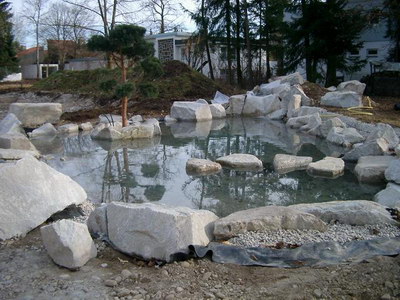 Premiere - die Steinwüste wird endlich Teich, das Wasser läuft ein. Ob die Trittsteine wohl auf der richtigen Höhe sitzten? Klar.