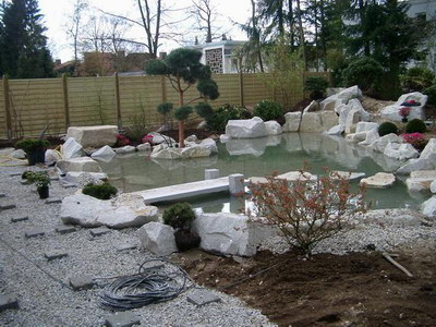 Endlich wird es grün! Jetzt kommen die Pflanzen. Große Rhododendron, Bambus, Azaleen, japansiche Kirschen, Eiben, Kiefern, Farne und Rollrasen, ...