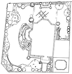 Dies ist der Vorentwurf für einen mediterranen Garten. Der Eingangsbereich und die Garageneinfahrt sind durch klassische Elemente formal geprägt. Eine große Kellerböschung an der linken Seite des Wohnhauses sorgt für ein lichtdurchflutetes Souterrain. Als Gegengewicht zu der Böschung haben wir links unten einen leicht erhöhten Sitzplatz geplant, hier zieht eine toskanische Amphore alle Blicke auf sich. Links oben ist ein schlichtes weißes Gartengerätehäuschen untergebracht, es dient zugleich als Sicht- und Schallschutz. Etwas unterhalb ist ein aus hellen Bruchsteinen angelegter Hügel, über den eine riesige Sternmagnolie ihre bizarren Äste ausstreckt. Auf der Terrasse (oben Mitte) sorgt ein mediterraner Wandbrunnen für frisches Ambiente. Die Anordnung des Brunnens ist so ausgerichtet, das man ihn auch aus dem Wohnzimmer immer "Miterleben" kann. Ein Vorentwurf zu diesem Brunnen befindet sich auf der nächsten Seite.