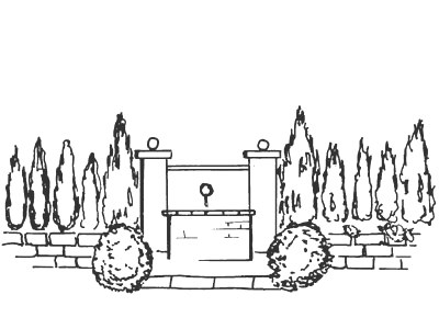 Vorentwurf für einen mediterranen Wandbrunnen. Die Idee für die Gestaltung eines Wandbrunnens wurde geboren, um die unansehnliche Betongartenmauer des Nachbargrundstücks zu verbergen, die direkt an der Terrasse sehr wuchtig erschien. Der Brunnen wird von einzelnen Smaragd-Lebensbäumen eingerahmt, die hinter einer Trockenmauer aus hellem Jurakalk gepflanzt sind. So konnte die Höhe der Betonwand noch etwas gemildert werden. Die großen geschnittenen Buchsbäume im Vordergrund vermitteln einen räumlichen Eindruck. Zentraler Blickpunkt der Anlage ist eine geschmackvolle - nach mittelalterlichem Vorbild gestaltete - Löwenmaske aus frostfester Impruneta-Terrakotta.