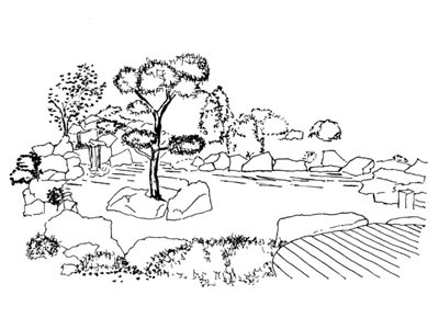 Wasser ist seit jeher Bestandteil des asiatischen Gartens. Die Skizze zeigt einen Teich mit einer kleinen Insel, auf der eine nach dem Vorbild eines Bonsai gestaltete Kiefer wächst. Im Vordergrund kann man die Holzterrasse erkennen, rechts gelangt man über einen Granit-Steg und einige Trittsteine in den Garten. Im Hintergrund an der Linken Seite sieht man einen Wasserfall unter dem Schirm einer japanischen Kirsche.