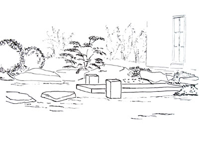 Der Granitsteg in der Perspektive, die Kombination aus Steg und einzelnen Trittseinen wirkt nicht so massiv wie eine Steinbrücke und lässt die Wasserfläche optisch größer erscheinen. Besonders reizvoll ist es, vom Steg aus die munteren Fische zu beobachten.