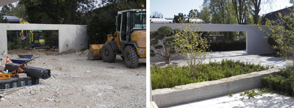 Im vorderen Bereich ensteht die Terrasse mit Sitzmauer, im hinteren Bereich - etwa dort wo jetzt unser Radlader steht - wird die Garagenzufahrt angelegt. Hinter dem Torbogen entsteht der Garagenvorplatz.