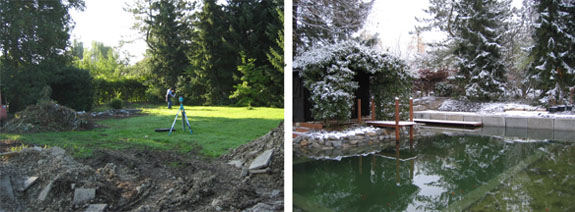 Auf der großen grünen Wiese ist innerhalb kürzester Zeit eine Badelandschaft mit Sauna, Sprungbrett und hölzernen Sonnendecks entstanden.