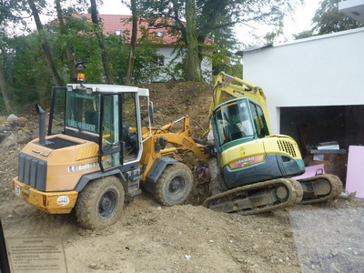 Bei diesem Kraftakt wird eine über vier Tonnen schwere Krustenplatte präzise an der frisch verputzen Garagenwand platziert.
