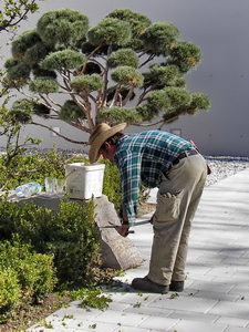 Natürlich kümmern wir uns auch um die Pflege der von uns gestalteten Gärten. Hier sorgen wir dafür, dass die Buchsteppiche in Form bleiben und der Groß-Bonsai im Hintergrund über die Jahre stetig an Charakter gewinnt.