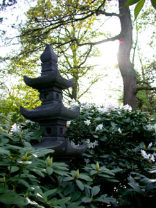 Geheimnisvoll eingewachsen kann man zwischen den Rhododendren eine Pagode aus Basalt entdecken, im Hintergrund das zarte Frühlingslaub der alten Eichen, die den Garten wie ein grosser Schirm überragen.