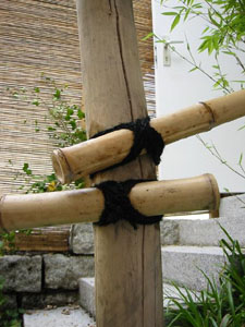 Traditionell gebundenes Treppengeländer. Bambusrohre wurden als Handlauf mit Sisalstrick an Eichenpfosten befestigt.