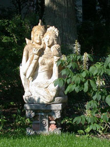 Fernöstliche Gottheiten fügen sich harmonisch in das Gesamtkonzept ein. Geschützt vom Dach der riesigen Eichen geniessen sie den Sonnenschein.