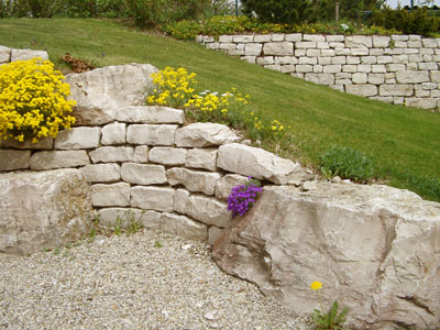 Durch umfangreiche Erdarbeiten konnten wir das Gelände lebhaft gestalten. Die riesigen Kalkstein-Felsen im Vordergrund vermitteln einen gediegenen Eindruck, sie bilden für den Grillplatz einen urigen Rahmen, der zusätzlich zum Sitzen und als Abstellfläche genutzt werden kann. Farbige Akzente setzen Steinkraut und Blaukissen.