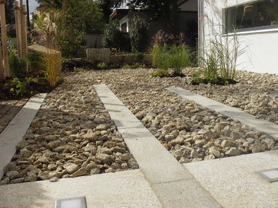 Steinreich: Stolz laufen die Granitbänder in der Schotterfläche des Vorgartens aus. Die frischgepflanzten Gräser werden bald für das notwendige Grün, Leichtigkeit und eine vertikale Struktur sorgen. Gut zu erkennen sind die Lichtelemente, die wir in die großformatigen Granitplatten eingelassen haben.