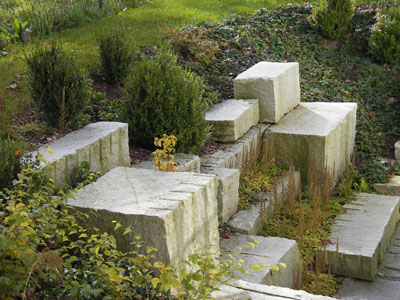Diese Kellerböschung besticht durch eine geschickte Anordnung aus streng geometrischen Würfeln, Quadern und flachen Riegeln.