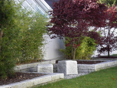 Die mit ihrem geometrischen Rahmen klar strukturierten Pflanzebenen erhalten durch die freche Anordnung der Granitquader eine weitere Dimension.