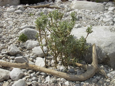 Alpiner Wildfluss: Frisch angeschwemmtes Treibholz, frisch eingepflanzt unsere Weide. Bis zum nächsten Hochwasser können sich hier Glockenblumen und Natternkopf ungestört ausbreiten.