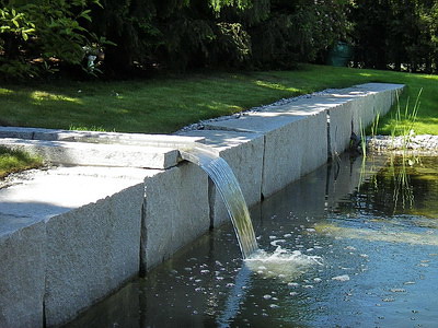 Straight: Aus einer Edelstahlrinne ergießt sich der Wasserfall in den großzügigen Schwimmteich. Die markante Reihe aus Granitquadern dient nicht nur zur Hangsicherung, sie ist auch - von der Terrasse betrachtet - ein außergewöhnlicher Hintergrund für die Teichanlage