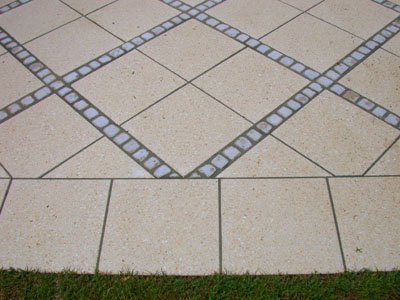 Diese Beton-Terrassenplatten mit sandgestrahlter Oberfläche werden durch ein Muster aus Dietfurter Kalkstein aufgelockert.