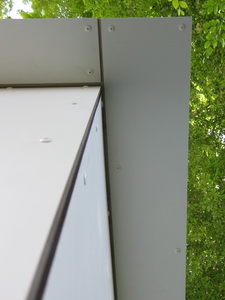 Die gesamte Außenseite des Gartenhauses wurde mit lichtgrauen HPL-Fassadenplatten verkleidet. Die Stöße und bewusst sichtbaren Fugen zwischen den Platten wurden mit verzinkten Blechprofilen hinterlegt.