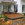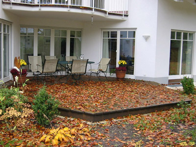 Eine sechseckige Holzterrasse in Herbstfärbung.