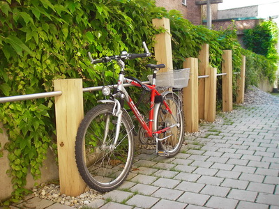 In munterer Gesellschaft haben sich diese Eichenhölzer versammelt: Wir haben sie mit einem zwölf Meter langen Edelstahlrohr verbunden und so in der engen Hofeinfahrt eine solide Möglichkeit geschaffen um Fahrräder zu parken und anzusperren.