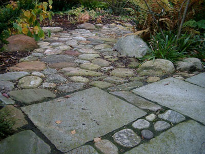 Ein Gartenweg, gepflastert mit „Bachbummerln“ führt zu einer Sitzbank. Der Übergang zum Hauseingang aus Beola-Gneis ist verspielt gestaltet.
