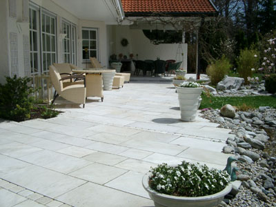 Rauriser Kristallmarmor Bahnenplatten wurden in verschieden Breiten mit getrommelten Kleinsteinpflaster kombiniert. Der Belag wirkt freundlich und hell, und ist dennoch äußerst pflegeleicht und beständig.
