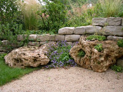 Glockenblumen und Steinbrech behaupten sich in der aus Dolomit-Bruchsteinen und Jurakalk-Quadern erstellten Trockenmauer.