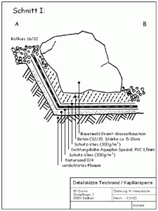 Die Randausbildung der Teichanlage. Damit es später nicht zu Wasserverlusten kommt und um den Nährstoffeintrag aus den umliegenden Pflanzbereichen dauerhaft zu unterbinden ist eine Kapillarsperre notwendig.