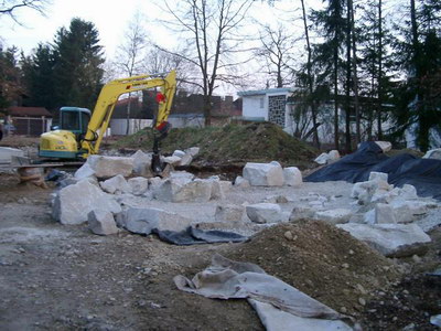 Die Steine werden ganz vorsichtig mit dem Bagger auf die Folie gesetzt.