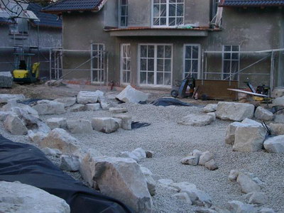 Die Zwischenräume werden mit Rollkies verfüllt, nach und nach kann man die volle Größe des Teichs erahnen.